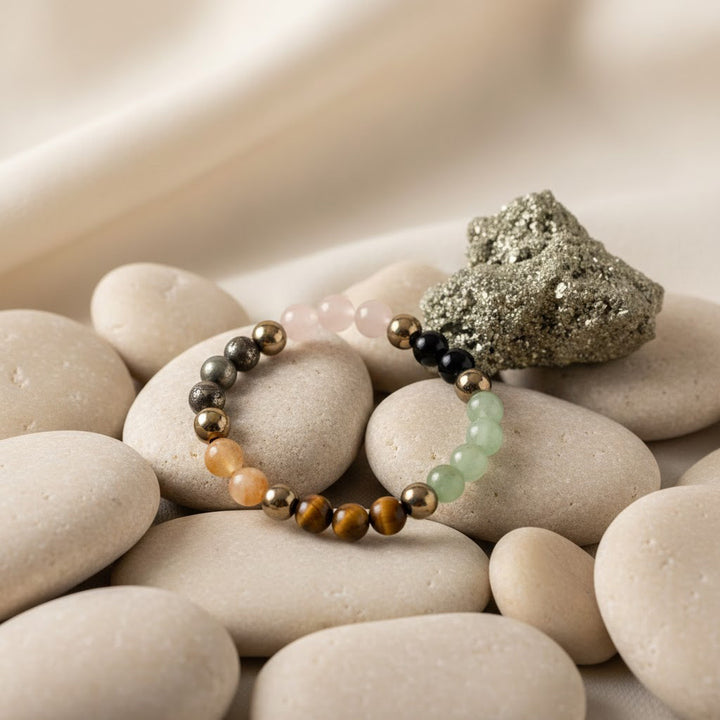 The Dhan Yog Bracelet combines Tiger Eye for confidence and decision-making, Pyrite for wealth attraction and protection, Citrine for manifestation and positivity, Clear Quartz for energy amplification, Green Aventurine for luck and opportunity, and Hematite for grounding and stability. The Raw Pyrite Stone further strengthens money-attracting vibrations and supports continuous prosperity energy in your surroundings.