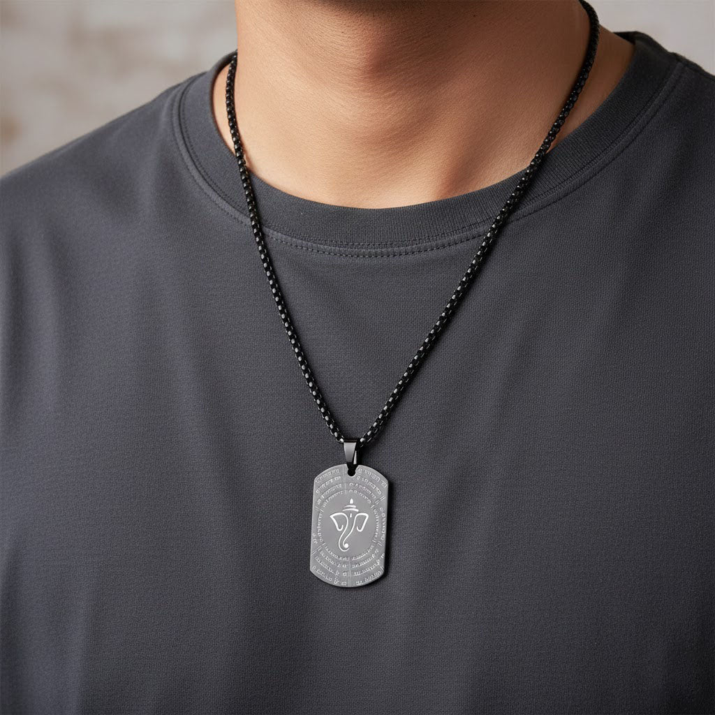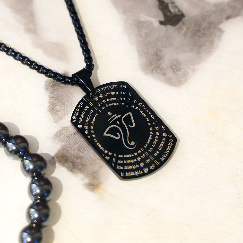 About Product: The Ganpati Shlok MicroCarved Black Pendant is a spiritually powerful accessory that features a finely micro-carved Ganpati shlok, symbolizing wisdom, prosperity, and the removal of obstacles. Crafted with precision detailing on a refined black finish, this pendant reflects devotion combined with elegant craftsmanship.